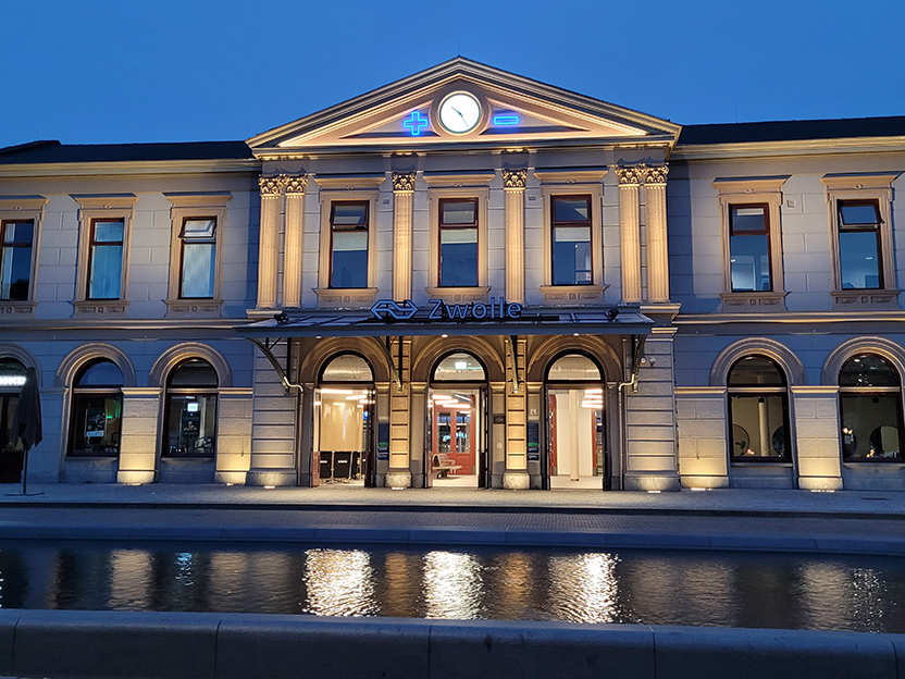 De voorzijde van het oude stationsgebouw van Zwolle heeft een nieuwe uitstraling gekregen. De nieuwe verlichting, ontworpen door Ronald Gijzel van Nobralux, benadrukt de architectuur van het monumentale pand en creëert een op een subtiele manier een aangename en prettige sfeer.